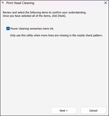 - Select Print Head Cleaning >Power Cleaning. You see a window like this: